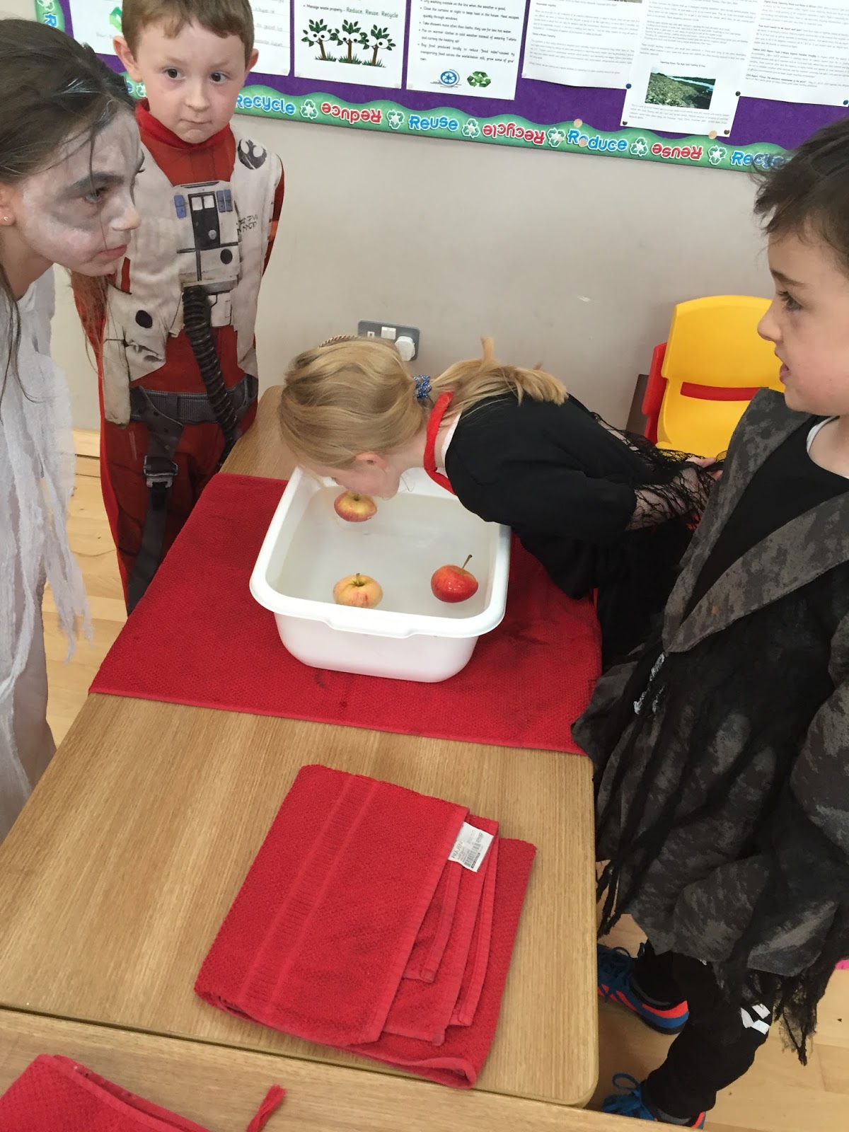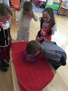 Halloween in First Class with fancy dress and fun Halloween games. We bobbed for apples and grapes and tried to take a bite of the hanging apple!