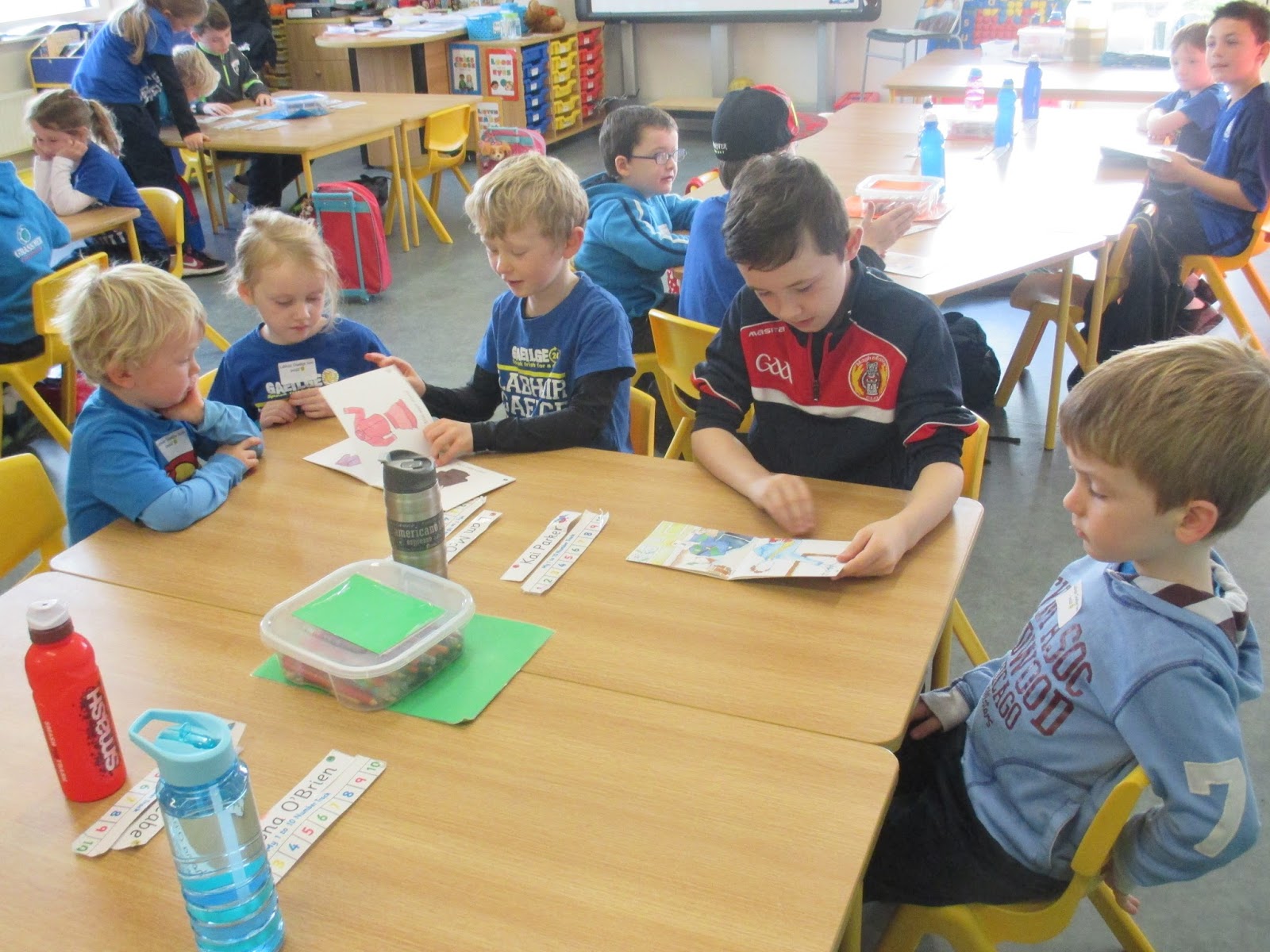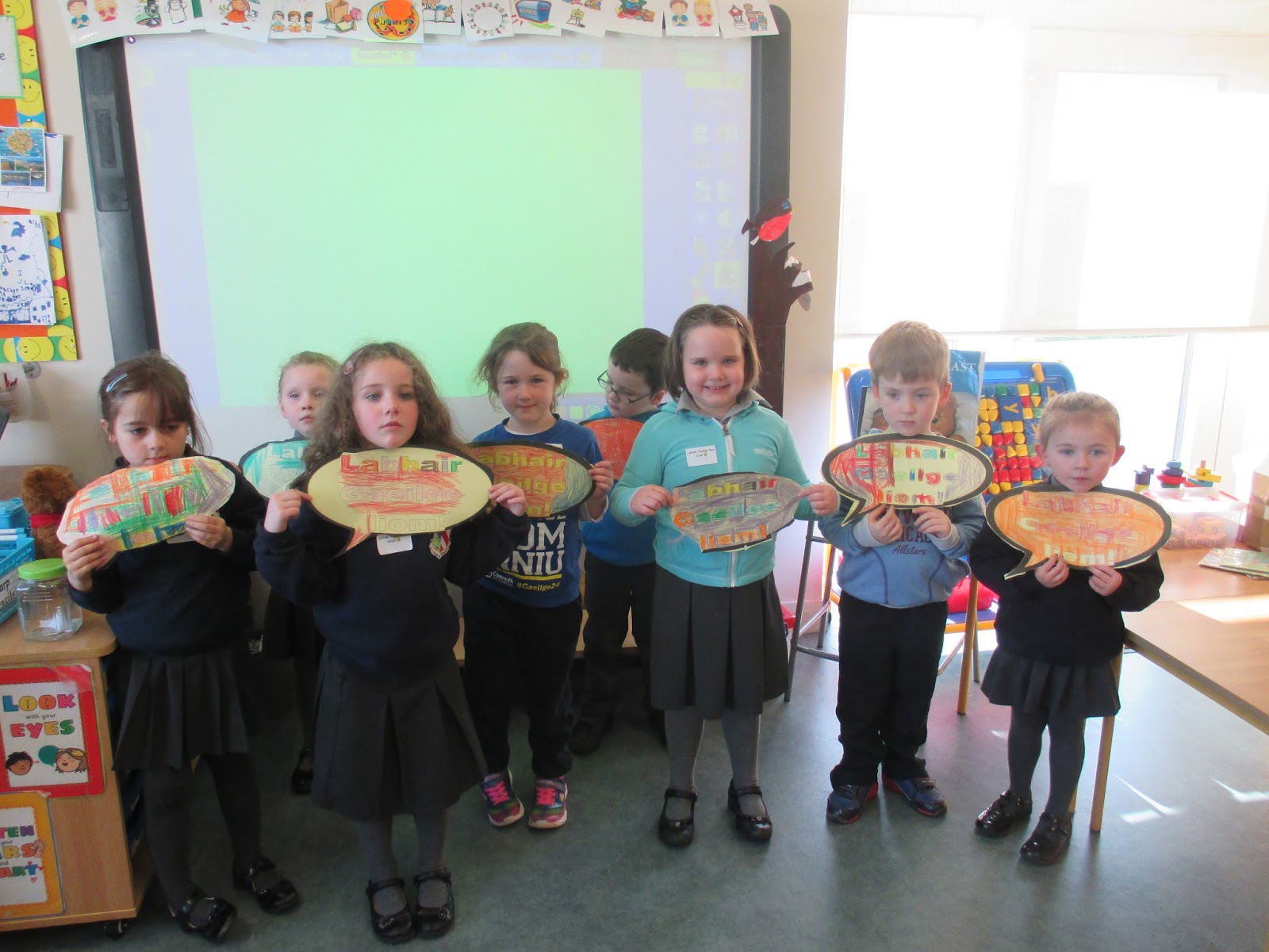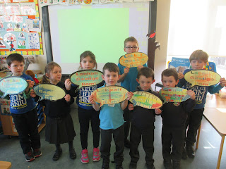 Bhí lá spraoi iontach againn le haghaidh lá gaeilge 24 an mhí seo. Ar maidin, d'imríomar a lán cluichí teanga sa rang. D'imríomar cluiche i gciorcal,  cluiche kim, cluiche cuimhne, cluiche mím, biongó agus cad atá sa mhála. Roimh an sos, tháinig páistí ón rang a trí agus a ceathar go dtí an seomra chun leabhair a léamh linn. Bhí sé sin ar fheabhas! Tar éis an sos, rinneamar píosa ealaín le chéile agus tar éis sin, bhí tionól againn sa halla. Rinneamar Aistear trí ghaeilge freisin. Lá iontach ab ea é.